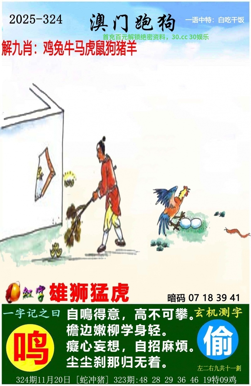 323期:今期鸡马鼠出特,五三仙子乘龙车开:鸡09准 ①杀猴兔蛇 ②图解特肖鸡马鼠虎牛 ③合单+小数 |